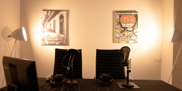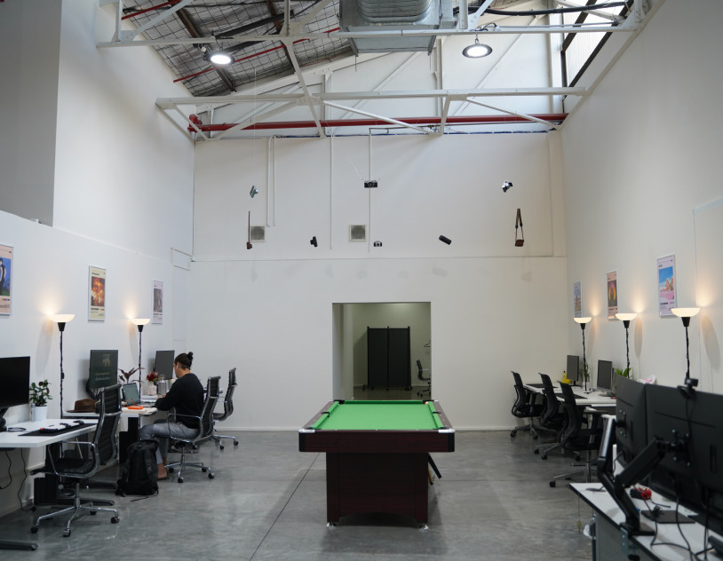 The open-plan film studio is an 8.2 x 4.7m space able to accommodate shoots with up to 10 subjects. With adjustable curtains and plenty of floor space - this studio is ideal for temporary sets, interviews, dance & movement pieces, and artistic works. The podcasting studio is a 4.3 x 3.6m room, housing a 2-microphone podcasting setup with audio interface and workstation. The space is designed to allow freedom of movement and flexibility of use, with capability to shoot video podcasts and host conference calls. The 11.7 x 6.1m main hall is home to themed workstations, a review station, general amenities, and breakout/recreational areas. Breakout areas provided include a pool table and large planning/relaxation corner.