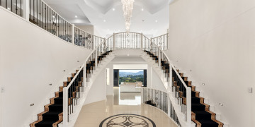 The estate announces itself from the moment you step inside. A double height foyer of extraordinary drama frames the property's signature dual curved staircase, wrought iron balustrades, cascading crystal chandelier and inlaid marble medallion floor — framing a perfectly composed view of the mountain ranges beyond. It is the kind of entrance that stops a room and defines a shoot.