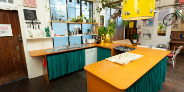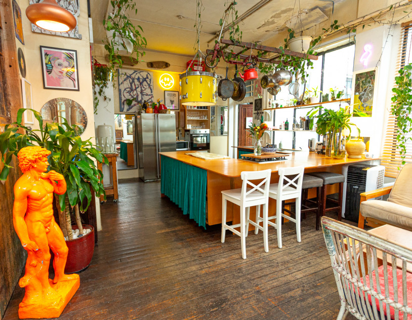Inside, the studio opens to a bohemian-inspired lounge, a versatile open-plan kitchen, and an expansive studio space with a 4-metre white wall — all drenched in natural light from oversized industrial windows that frame sweeping views of the Sydney city skyline.