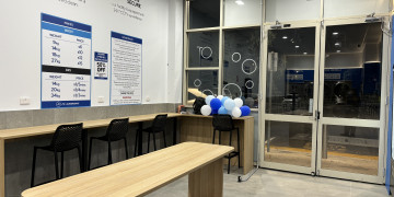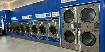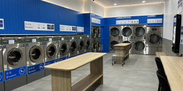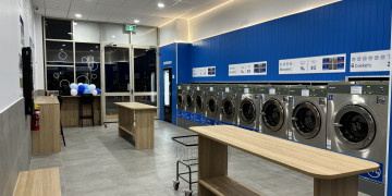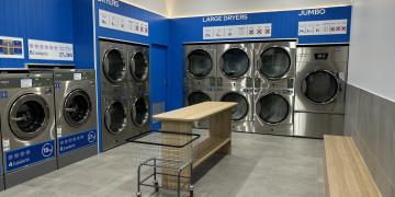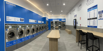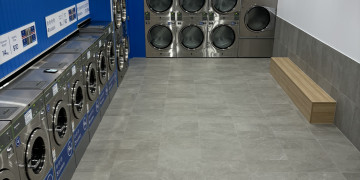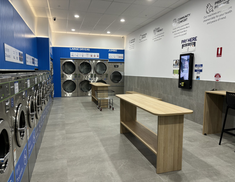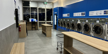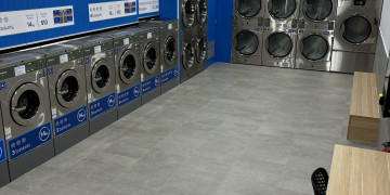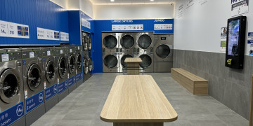 Brand-new self-service laundromat with plenty of open space and movable folding tables to create an amazing themed set location with washers and dryers in the background.