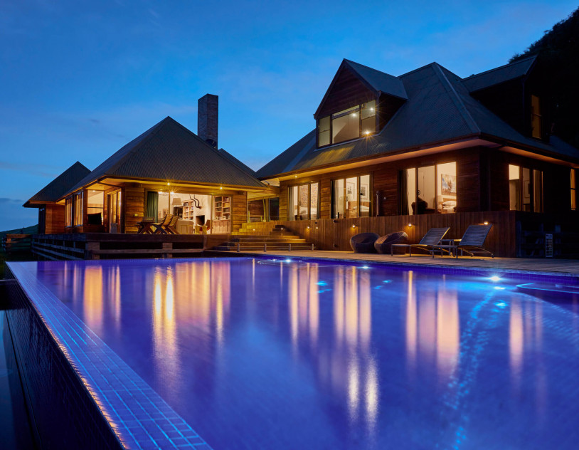 This estate features large light-filled bedrooms, a well-equipped kitchen, open log fireplace, infinity pool, entertainment room, and an all-encompassing deck featuring sweeping coastal views.