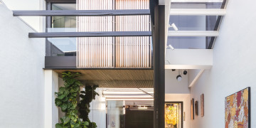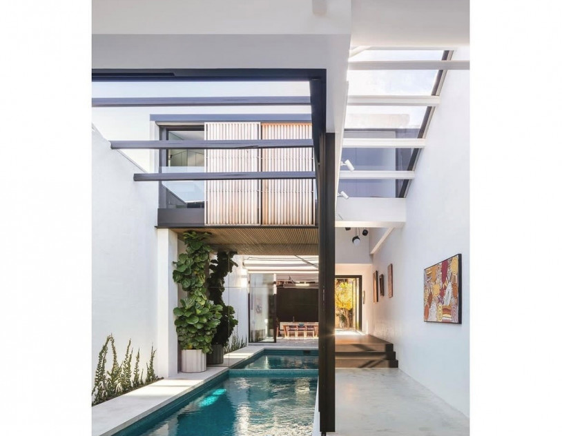 Framehaus is a bold and beautifully executed warehouse conversion tucked into the heart of Leichhardt. With a rich past as both a winery and an upholstery workshop, the space retains its industrial soul while embracing a clean, contemporary elegance. Its original sawtooth roofline, steel beams, and soaring ceilings create a dramatic architectural backdrop, softened by curated interiors and a considered flow between zones.