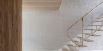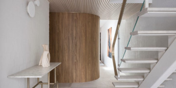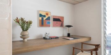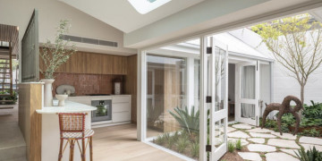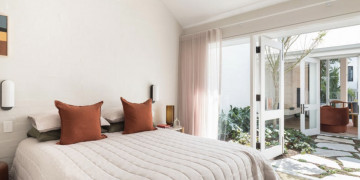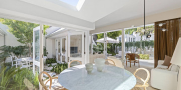 The property boasts sleek, contemporary architecture with whitewashed brick exteriors and a lush, landscaped courtyard. Its interiors are thoughtfully designed with natural wood finishes, open-plan layouts, and elegant furnishings. The dining area features clean lines and modern lighting, while the serene living spaces flow seamlessly into the outdoor entertainment areas, complete with a sparkling pool.