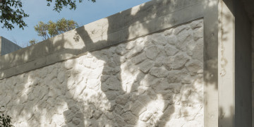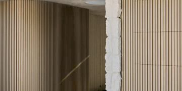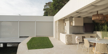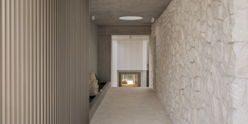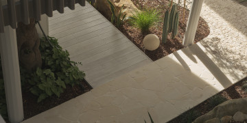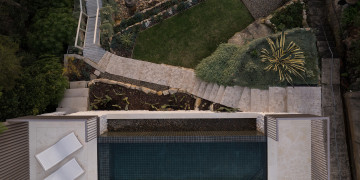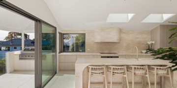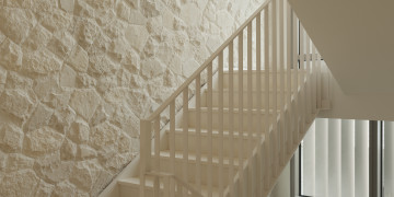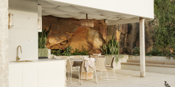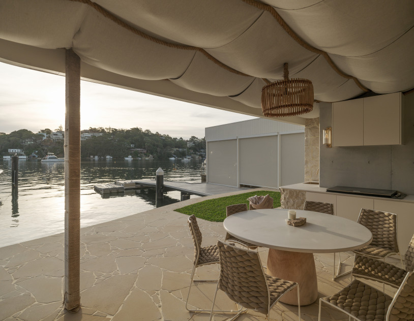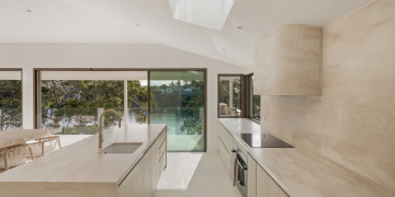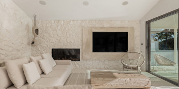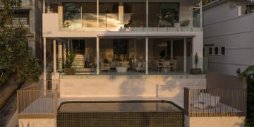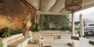 A private beach and bespoke timber cabana offer moments of pure escape, while the property's signature infinity pool seems to float seamlessly into the bay below — an uninterrupted horizon that shifts with the light. The home’s hero materiality — white limestone, random rock-dressed walls, and crazy pave stonework — anchors the exterior in texture and tone, creating a harmonious rhythm with the surrounding landscape.