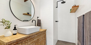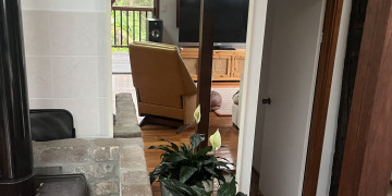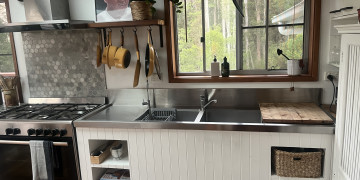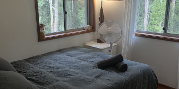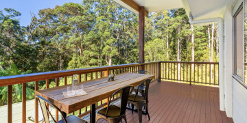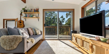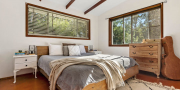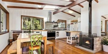The upper level of the property features four spacious bedrooms, each styled with French linen sheets and large windows that frame the surrounding forest. The open-plan kitchen and lounge exude a retro charm with warm timber finishes and eclectic 70s-inspired decor, creating an inviting and visually unique interior. The wrap-around deck is designed to embrace natural light at all times of the day, making it ideal for outdoor shoots or relaxing gatherings. Equipped with a BBQ and smoker, the alfresco space is as functional as it is picturesque.