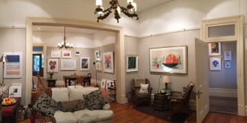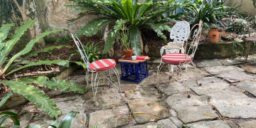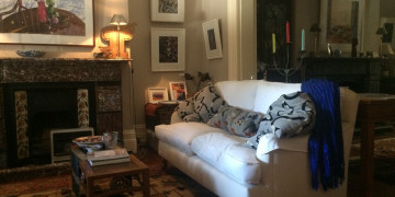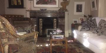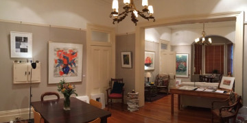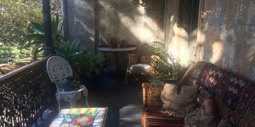 Afternoon Light streams in from the kitchen window. Original six inch wide Kauri pine boards are on the floors throughout the home, with beautiful rugs and carpets adding a splash of colour along with the art. An artist’s studio is on the first floor, opening onto a balcony of succulents, that overlooks the greenery in the garden. There is a large main bedroom, with 2 sets of French doors opening on to the fabulous balcony, overlooking Hollis Park. There are 2 bathrooms, one of which has the sweet original basin, Morrocan tiles on the floor, and marble tiles on the walls. this beautiful location has an ambience that exudes warmth and creativity, perfect for your next project or production.