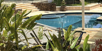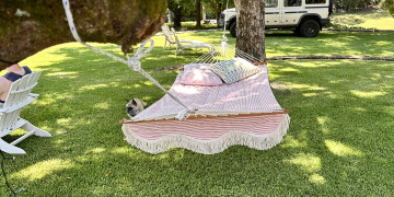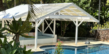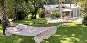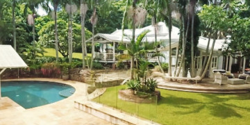 Outdoor spaces are equally enchanting, with two fire pits surrounded by white chairs and hammocks offering cozy areas for evening gatherings or relaxed shoots. The terraced gardens lead to a vegetable patch, an old citrus grove, and a 100-year-old frangipani tree encircled by a labyrinth. Paths wind through a regenerated rainforest, gum trees, and a palm forest, providing endless opportunities for exploring and capturing the beauty of nature. A lagoon enhances the picturesque surroundings, adding to the estate’s serene and magical ambiance.