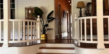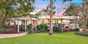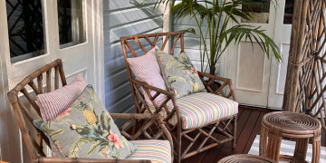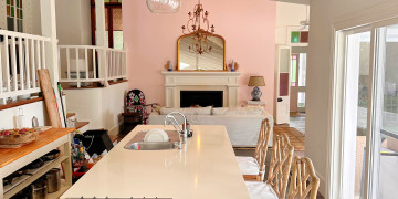The property’s Palm Beach-inspired swimming pool, framed by tropical landscaping, a cabana, and a pool house, delivers an effortless sense of luxury. The main home, built in 1910, exudes vintage charm with its high ceilings, headlight windows, and cozy nooks for reading or relaxing. The open-plan living area, designed in a refined British Colonial style, features an open fireplace and seamlessly blends modern sophistication with timeless character. Throughout the home, vintage and designer furnishings, high-end fabrics, and vibrant colour accents create a versatile space that can transition between classic country charm and contemporary elegance.