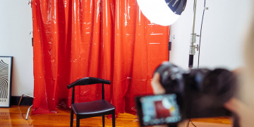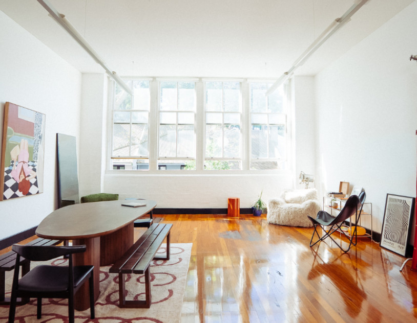 The converted warehouse space features a versatile open layout with polished timber floors, soaring ceilings and large street facing windows that flood the interior with natural light throughout the day. The space has been thoughtfully curated with original artwork, considered furniture and a signature red vinyl curtain that adds a bold and distinctive visual element to any production. Every detail has been chosen to support creativity, experimentation and seamless workflow.