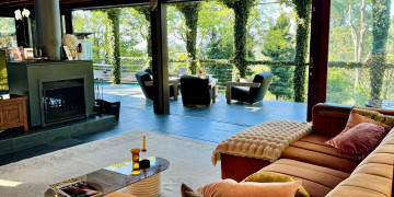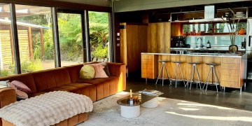 Living areas include a luxury standalone cabin style master bedroom with ensuite, a spacious main living area with open plan lounge, dining and custom kitchen space anchored with stunning double sided Jetmaster fire place, plus 2nd bedroom with balcony and separate bathroom.