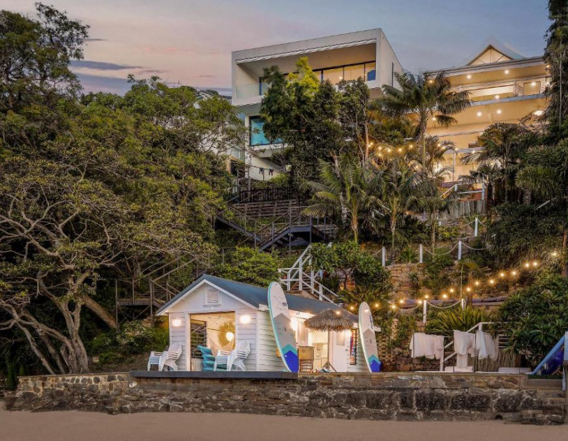 The property cascades down a lush tropical hillside to the water's edge, where a private beach shack sits flanked by surfboards, stand up paddleboards and a palapa umbrella bar looking directly out over the brilliant turquoise waters of Port Hacking. String lights, a bamboo outdoor shower, frangipani trees and sprawling timber decks draped in white cushions and hammocks complete an outdoor environment that reads as effortlessly cinematic at any time of day.