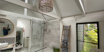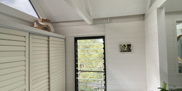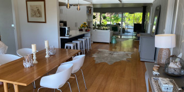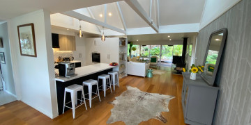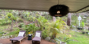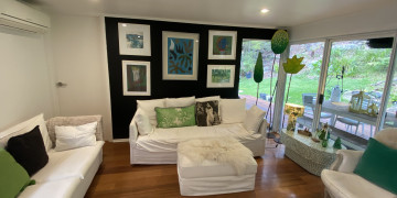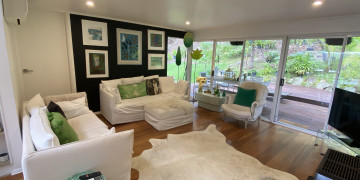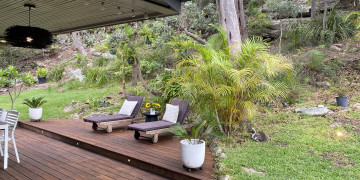Beyond the main outlook, a lush tropical garden unfolds at the rear, offering a contrasting, grounded environment rich with texture and greenery. Native wildlife, including wallabies and goannas, frequent the area, reinforcing the property’s unique connection to its natural surroundings.