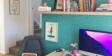 The modernised kitchen features stunning windows looking out onto a manicured lush garden. An expansive living area features panelled windows, whilst a large master bedroom features grooved panels and balcony views over Pittwater. A 1950s style sandstone pool is north facing. A home office with wallpaper feature and wooden shelves adds colour to the room. This original, eclectic modern suburban home is ideal for shoots with multiple areas to utilise and room for crew with their equipment.