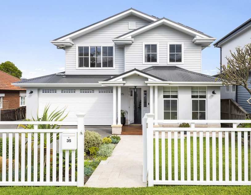 Introducing The Producer, a stunning suburban residence epitomizing the Hampton style. This home boasts an immaculate exterior with clean lines and classic design elements, featuring a pristine white facade, elegant details, and a welcoming front porch, perfectly complemented by a well-maintained garden and a white picket fence.