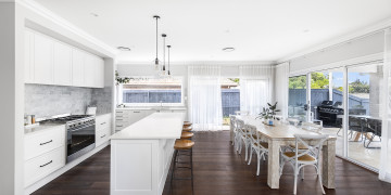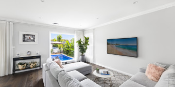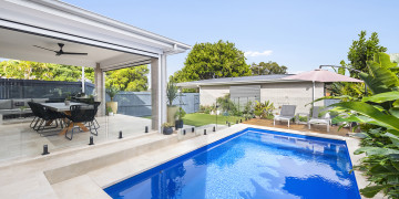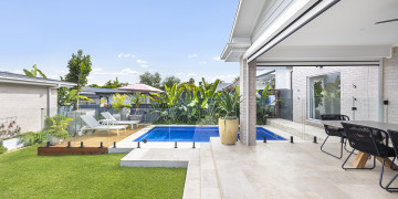 Step inside to discover large, bright rooms designed for comfort and style. The open-plan kitchen and dining area offers ample space, modern appliances, and sleek finishes, making it ideal for gatherings. The modern outdoor entertaining area includes a patio, seating, a barbecue setup, and a sparkling pool surrounded by lush greenery, creating a private oasis perfect for relaxation and entertainment.