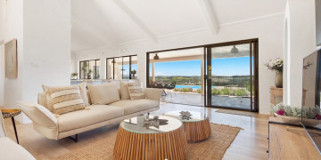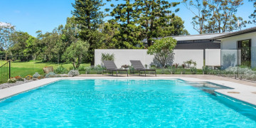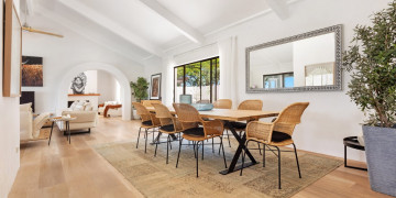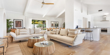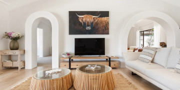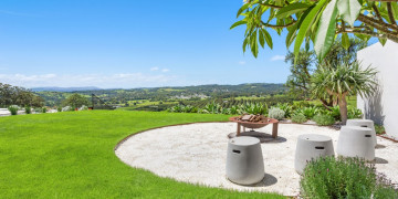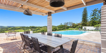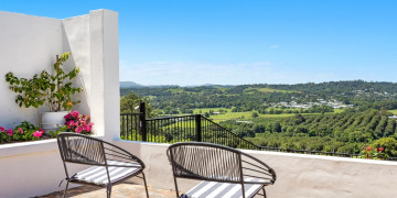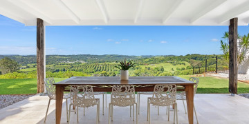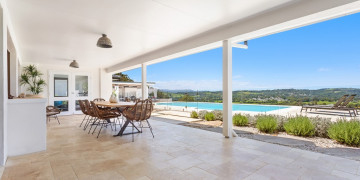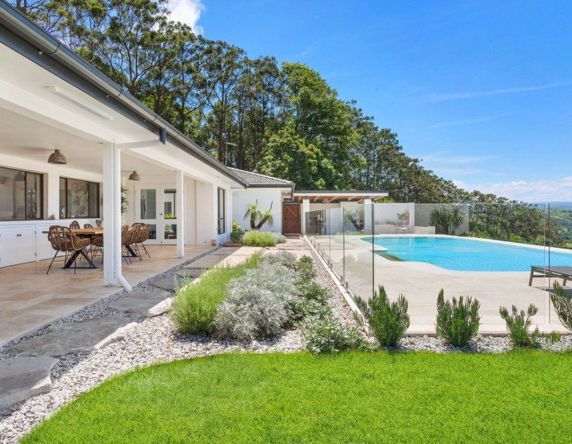 Sitting high on a hill in the exclusive Bangalow Hinterland, this picturesque fully renovated Mediterranean inspired oasis provides peaceful hinterland vistas, lush rolling hills and spectacular skies from sunrise to sunset. This serene location features multiple living spaces, 6 bedrooms and 4 bathrooms with modern interiors with natural and neutral tones that have been thoughtfully selected, adding to the peace and tranquility that its surroundings exude.