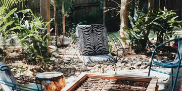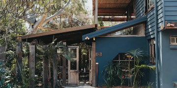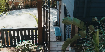 Tropicalia's lower floor of the two storey tree house has two queen bedrooms with one bathroom, a fully equipped kitchen and laundry facilities. The lounge and dining room open onto a patio set beneath a beautiful big gum tree, tropical gardens and one outdoor shower.
