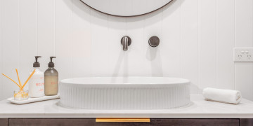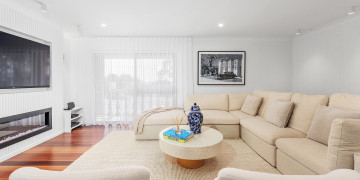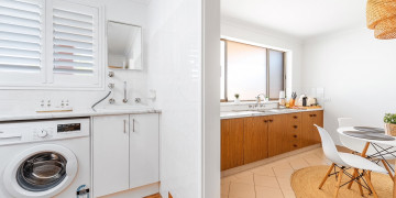 This immaculate, recently renovated 800 sqm location is situated only a stones throw from one of the most pristine beaches in the world. The retro red brick facade opens to light white carefully curated interiors and Laminex Demi Round feature paneling which extends through the foyer and stairwell.