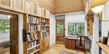 Inside, tall cedar-lined ceilings, stained glass details and generous windows create a soft, natural light throughout the day. The home features four bedrooms, each offering a different shooting opportunity — including two spacious rooms with French doors opening directly onto the wraparound verandah, a smaller bedroom, and a lofted space that adds visual interest and flexibility for set styling.