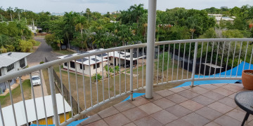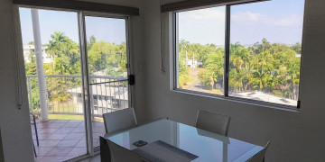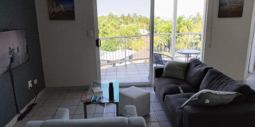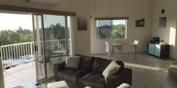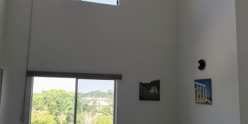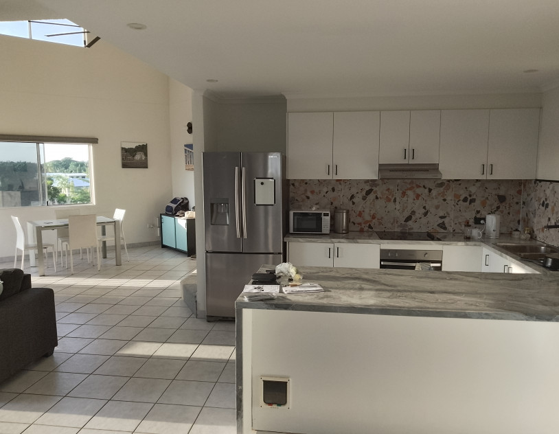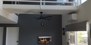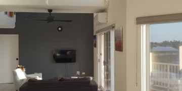 Distinctive touches include a large, contemporary ceiling fan, a dramatic staircase with artistic lighting, and a bridge that connects to an upper balcony. From here, enjoy panoramic views of lush tropical greenery and the picturesque harbor in the distance.