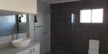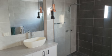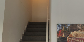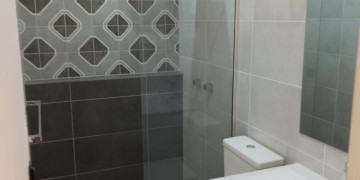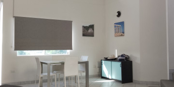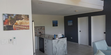 Meet Manx—a top-floor apartment with an airy, double-height design and a stylish mezzanine level. Its six-meter-high ceilings are framed by expansive glass panels on both lower and upper floors, creating an open, light-filled living area that spans the width of the building. The modern kitchen at the rear features a spacious marble-effect countertop.