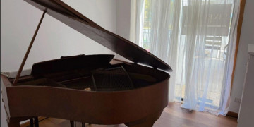 The ground floor features an open plan living and dining area with a fully equipped kitchen, alongside two bedrooms and a bathroom with bath and shower. A separate piano room offers an additional character space, while the surrounding layout provides multiple everyday domestic backdrops within one level.