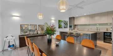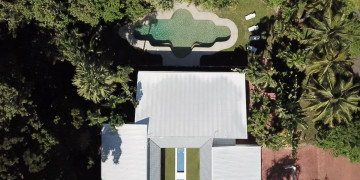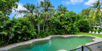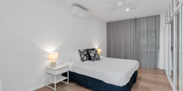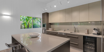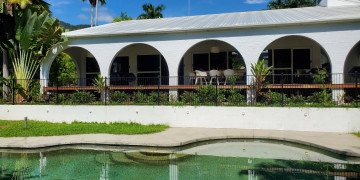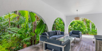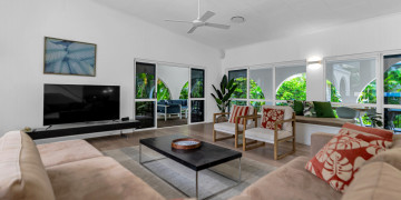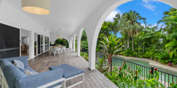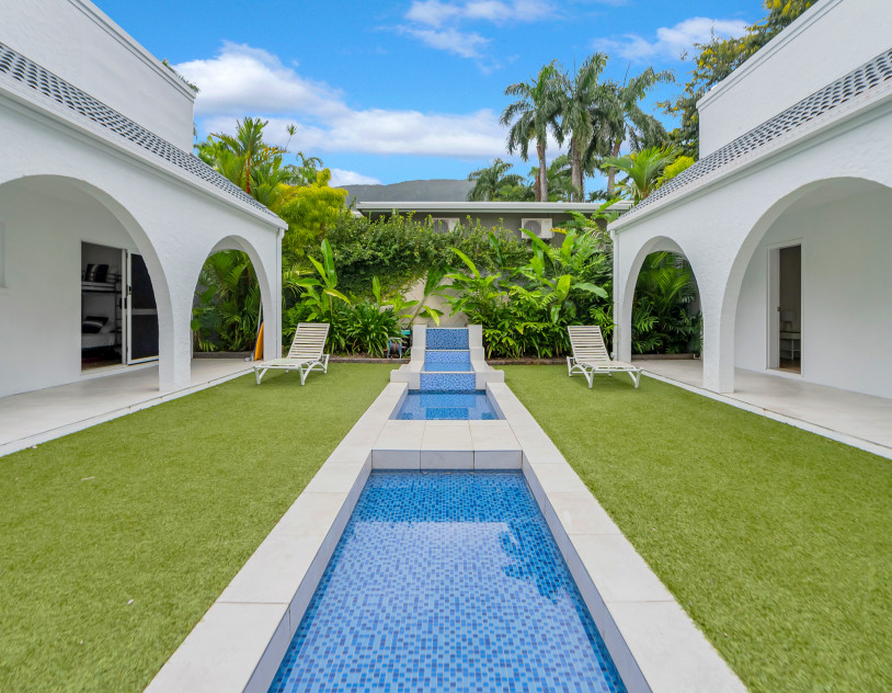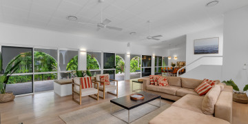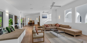The spacious open-plan living area features high ceilings and glass walls of sliding doors that allow natural light to flood the space. The living area is decorated with luxurious furnishings and tropical accents. Three beautifully appointed bedrooms plus a master bedroom all lead off the central courtyard. This impressive light and bright location is the perfect blend of modern elegance & tropical style. It brings a touch Palm Springs or Hollywood to its FNQ locale, providing multiple spaces for shoots or film productions.