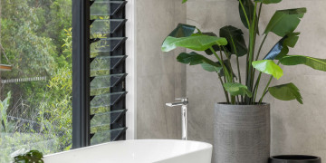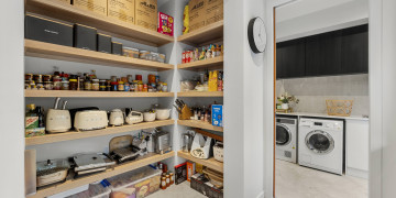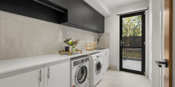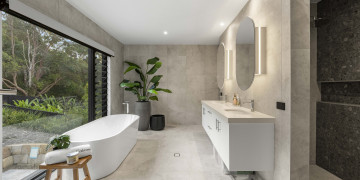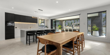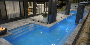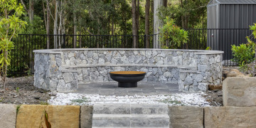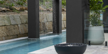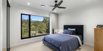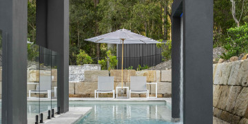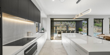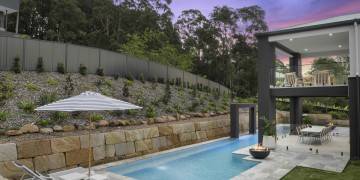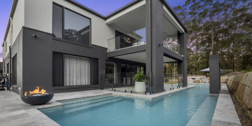 At its heart lies a showstopping 20-metre resort style pool, complete with an illuminated waterfall and water jets, wrapping around the home to create a seamless indoor-outdoor flow. The main living and kitchen areas open directly onto the pool terrace and outdoor room, leading up to a dramatic stone fire pit zone—perfect for golden hour or night shoots. Every vista offers depth and texture, from the sleek modern interiors to the layered sandstone retaining walls and lush hinterland surrounds.