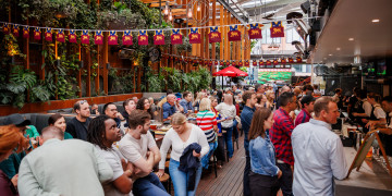 At its core is a sprawling open air beer garden, framed by lush greenery and a distinctly tropical feel that contrasts with the surrounding urban landscape. This oasis like setting is complemented by multiple bars, dining zones and private function areas, creating a layered environment suited to everything from casual gatherings to large scale events.