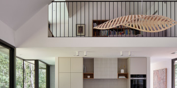 A glazed entry corridor leads down to the main pavilion, where a generous open plan living, dining and kitchen zone offers a versatile backdrop for film and photography. A mezzanine overlooks the pavilion, adding functional shooting opportunities and cinematic sight lines.