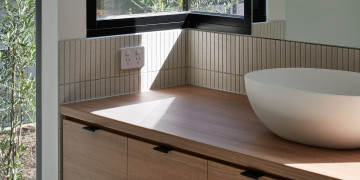 Sustainability and environmental sensitivity guide the form. The home is oriented east–west to maximise northern light, enhance passive solar performance, and create a warm, inviting interior throughout the cooler months. Inside, a restrained palette of Tasmanian Oak, dark burnished concrete and Basket Range stone adds depth, texture, and a sophisticated yet understated atmosphere.