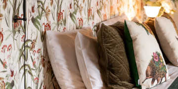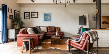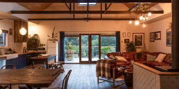 Highland Barn features two master bedrooms with king-size beds, along with two additional spacious bedrooms with twin single beds and a fold-out bed. The master suite provides added privacy with its own walk-through wardrobe and ensuite, while the main bathroom features a luxurious walk-in waterfall shower.