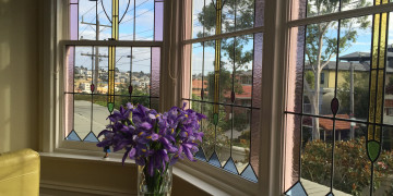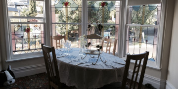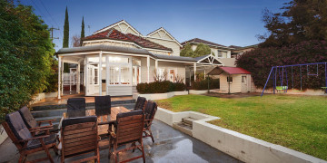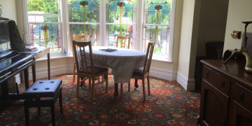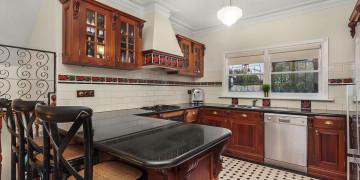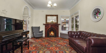 Inside, Aberley seamlessly blends vintage character with refined details. Leadlight windows, Turkish-style carpets, and an open fireplace add warmth and sophistication, while the dark wood kitchen with striking black and white tiles brings a touch of old-world grandeur. The upper level features three well-appointed bedrooms, a family bathroom, a dining room with a charming bay window, and a piano room with a large black Provincial bookcase, offering spaces rich with texture and visual appeal.