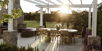 Bifold doors seamlessly connect the interior to the terrace, pool, and spa area, while the pergola offers an outdoor dining and lounge space in front of a striking stone fireplace. Expansive gardens and natural bushland create endless outdoor possibilities, providing both lush greenery and rustic charm.