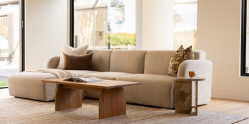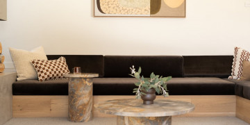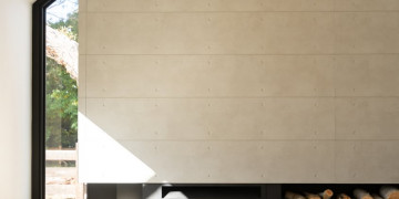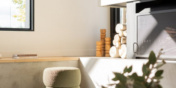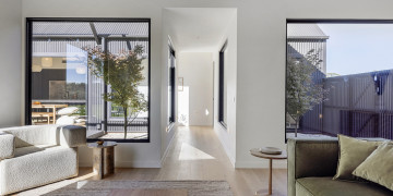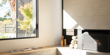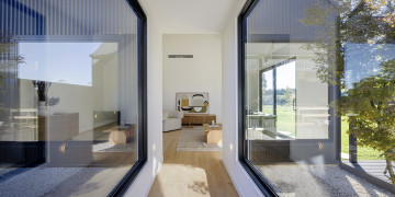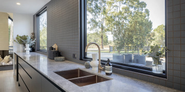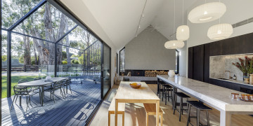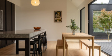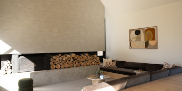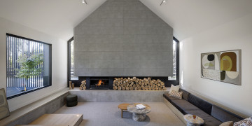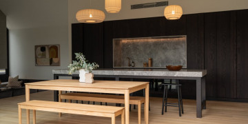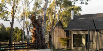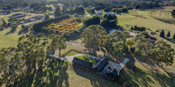 The interior features oversized glazing that seamlessly integrates the rural landscape into the spacious open-plan living areas, boasting a Jetmaster wood fire and high-raked ceilings. The sunken lounge, with custom velvet seating and a gourmet kitchen equipped with high-end Bosch appliances and a butlers pantry, cater to the luxurious feel of Barn Song.