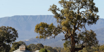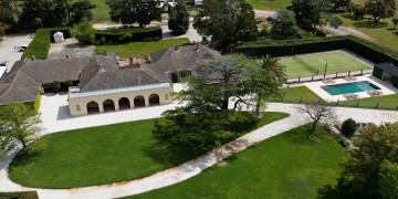 Striking external arches in the Spanish Colonial Revival style are a defining architectural statement, while the interiors reflect a luxury old-world aesthetic with art deco flourishes. Surrounded by rolling English gardens, cypress hedges, a rose garden, and an iconic 12-metre date palm, the property offers endless styling opportunities. Beyond the homestead, the wide-open landscape encompasses farming land, swamps, creeks, and redgum trees, all framed by a dramatic mountain range backdrop.