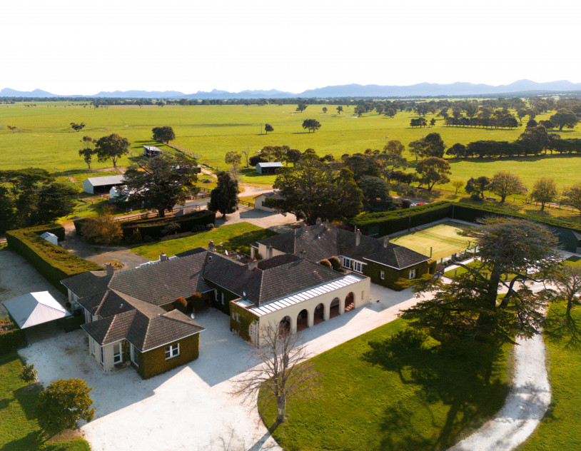 This incredible historic location, nestled at the foothills of the majestic Grampians National Park, was founded in 1842 as one of Australia’s first pastoral holdings. While the original 19th-century homestead was sadly destroyed by fire, sections of the bluestone and slate roof remain. A significant renovation in the 1920s introduced elegant Art Deco influences throughout, including detailed cornice work, pendant lights, fireplaces, and Jarrah floors. Today, masterfully curated modern country interiors blend seamlessly with heritage character, creating a truly unique backdrop for productions and events.