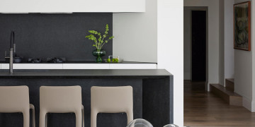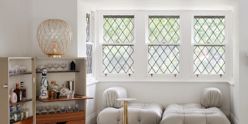 The design language throughout the home is shaped by geometry drawn from the original architecture. Triangulated forms appear in bespoke joinery and in distinctive leadlight motifs that run through walls and windows, creating a subtle dialogue between past and present. In the master suite, bush hammered stone surfaces are paired with a dramatic glass skylight ceiling, inviting natural light and the morning sky into the space.