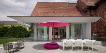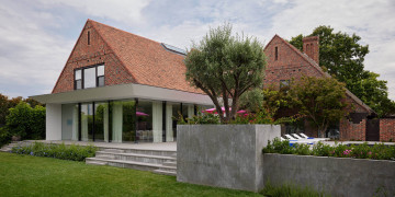 A contemporary extension continues the home’s architectural narrative. A glass volume sits seamlessly alongside the original façade, creating a generous entertaining area filled with natural light. Oriented to capture northern sun, this new wing opens toward the gardens and softens the transition between indoors and outdoors.