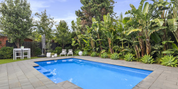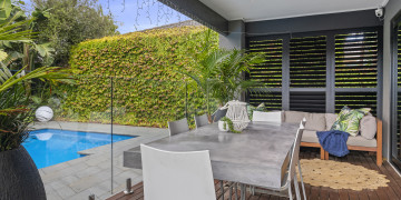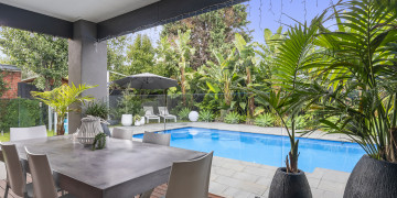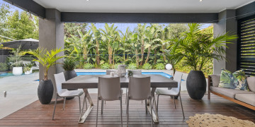 The large open plan living space opens out to a deck which borders the resort style back garden complete with a backdrop of banana palms sits next to the aquamarine pool creating a lush serene space for shoots or productions.