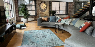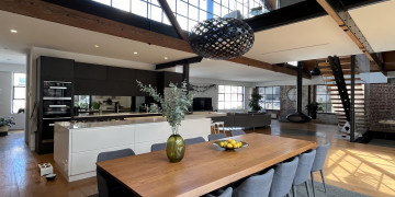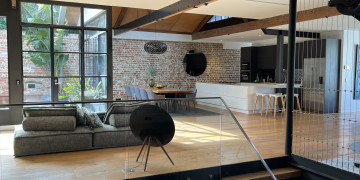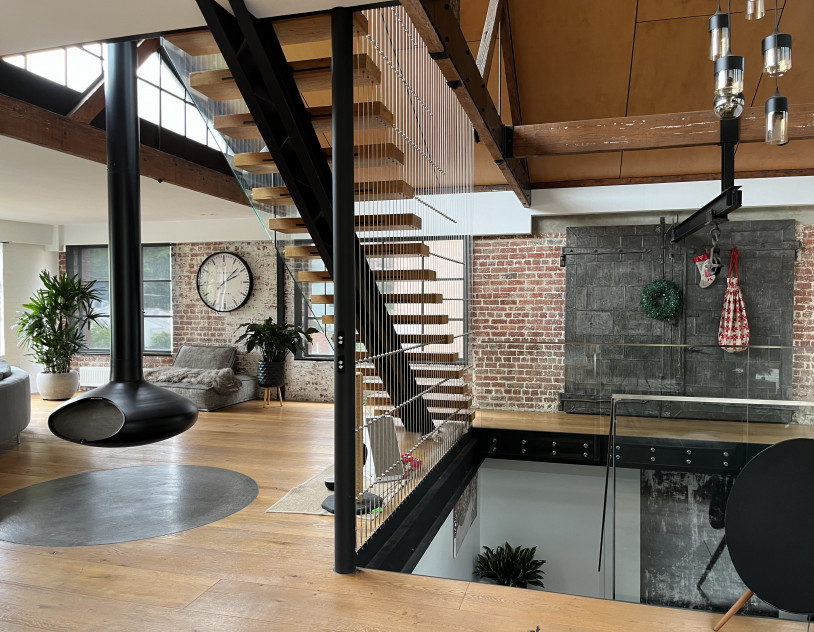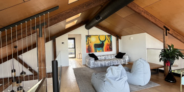 The vibrant living area features modern furnishings, pops of colour, and greenery, blending warmth with industrial chic. Large industrial windows flood the space with daylight, making it ideal for natural-light photography or cinematic storytelling. The top-level loft area, with its vaulted ceilings and cozy furnishings, provides a serene yet stylish setting for interviews, editorial shoots, or brainstorming sessions.