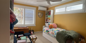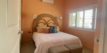 The living room showcases bold, warm tones and an inviting layout, complete with arched detailing and soft natural light streaming through plantation shutters. Retro-inspired furnishings and curated design elements make this a standout space for lifestyle shoots or intimate scenes.