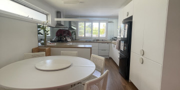The kitchen and dining area exude modern minimalism with clean lines, white cabinetry, and natural wood flooring. The round dining table with cane-back chairs adds a touch of elegance and texture, offering a sleek, adaptable space for culinary or conversational scenes.