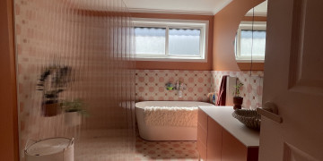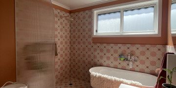 The bathroom is a showstopper with its peachy-pink palette, geometric tiles, and a chic freestanding tub. A curved privacy screen and stylish finishes give this space a playful yet refined atmosphere, ideal for editorial or lifestyle photography.