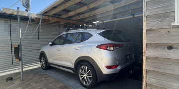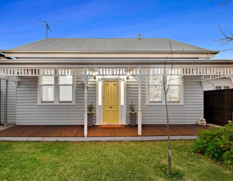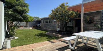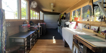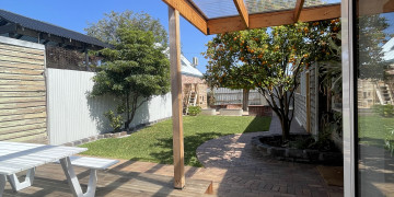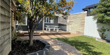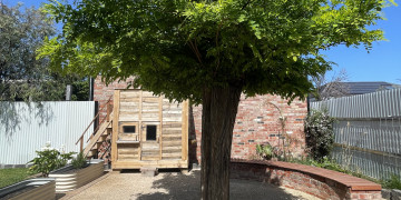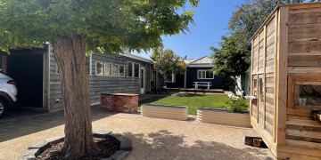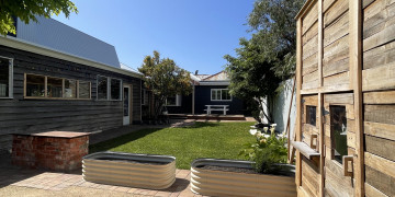 Outdoors, the landscaped yard features a central tree surrounded by a paved courtyard and decking, perfect for capturing relaxed, alfresco vibes. Raised garden beds, timber accents, and plenty of natural light enhance the outdoor appeal. The backyard also boasts a rustic wooden outbuilding, offering another layer of visual interest.