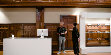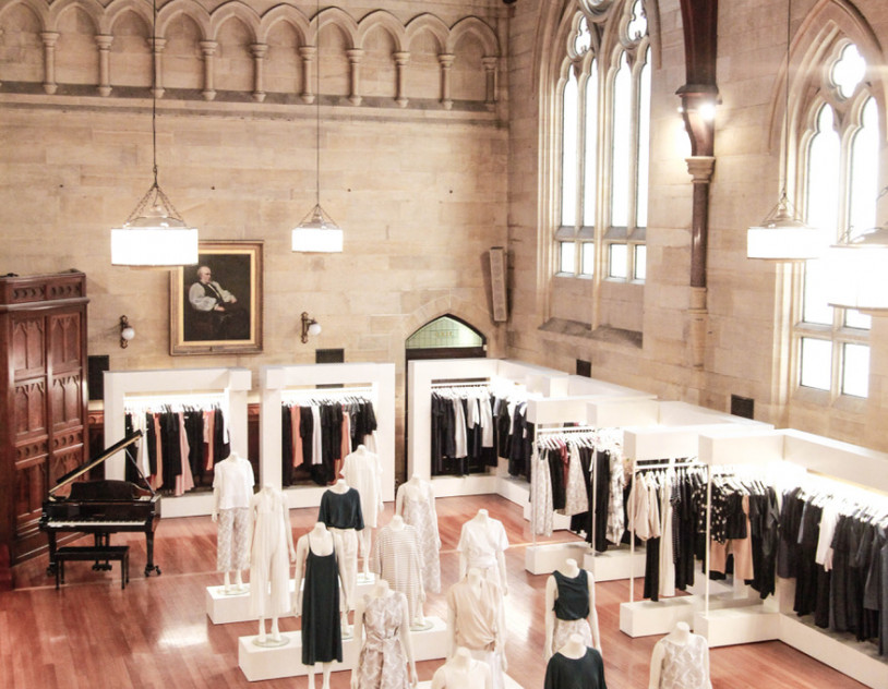 Today, the cathedral-like interiors retain their hushed ambience. Entering from Flinders Lane, the city’s bustle instantly falls away. Vaulted ceilings rise to dramatic peaks, stained-glass windows cast colourful light across the stone, and the setting—punctuated by sculptural mannequins—feels almost like a fashion-infused chapel.