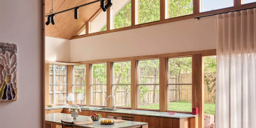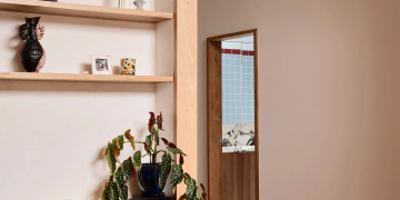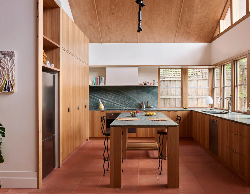 The open-plan living and kitchen foster a natural flow, bathed in soft, golden light that pours through expansive windows. Terracotta floors, bagged-out brick walls, and handcrafted details create a tactile richness, while vintage furnishings and muted tones add a sense of timeless ease. Every surface tells a story, from the raw, imperfect beauty of the walls to the way sunlight dances across the space, shifting throughout the day.