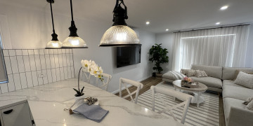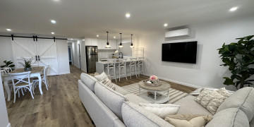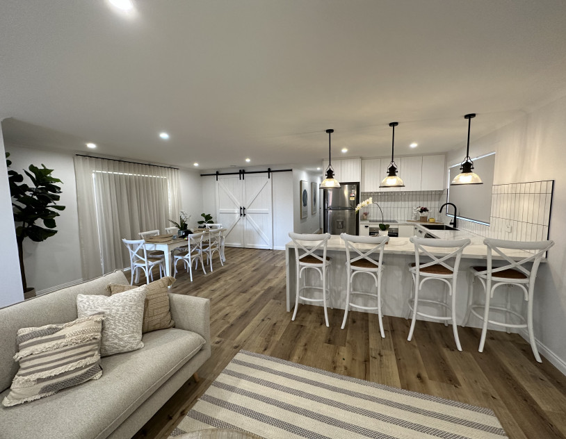 The home features three bedrooms, including two with queen beds and a bunk room with a single top and double bottom bed, offering versatility for various production or event needs. Two fully renovated, modern bathrooms add to the home’s contemporary appeal, while the recently transformed backyard boasts a sleek and stylish design, perfect for outdoor shoots or small activations.