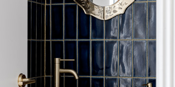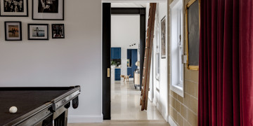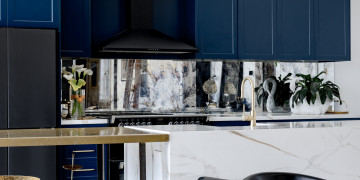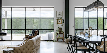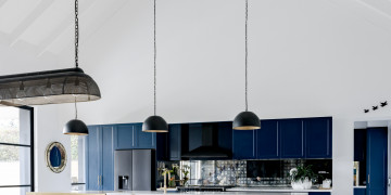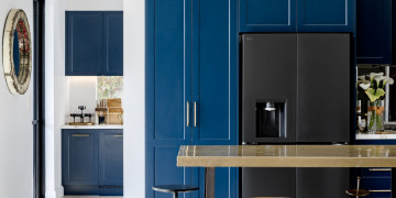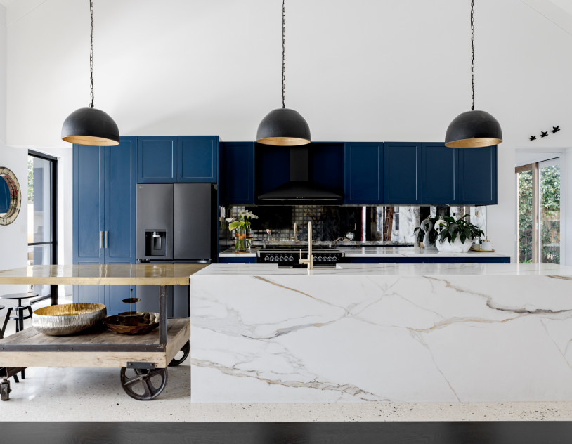 At the heart of the home is a showpiece chef’s kitchen, bold yet sophisticated, combining deep navy cabinetry with brushed gold hardware, a dramatic marble-wrapped island bench, and matte black appliances. It’s a cinematic centrepiece—equally suited to high-end food styling, lifestyle shoots, or slow, ambient content. The kitchen flows seamlessly into a voluminous open-plan living and dining area where high ceilings, curated furniture, and generous glazing invite light and calm into every frame.
