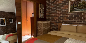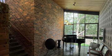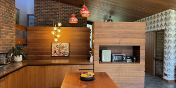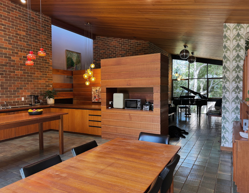 This impeccably preserved 1974 home is a dream setting for film, photoshoots, and distinctive events. Situated on a spacious 1025sqm lot, the residence celebrates its original 70s architecture, featuring split-level living areas, striking angular windows, and pitched cedar ceilings. With 4 bedrooms, 2 bathrooms, and dual living areas, the home showcases iconic Australiana style through exposed brick, cedar paneling, and lush green flora-patterned wallpaper. Retro details like 70s chandeliers and earth-toned tiled bathrooms set a rich, authentic scene with endless visual opportunities.